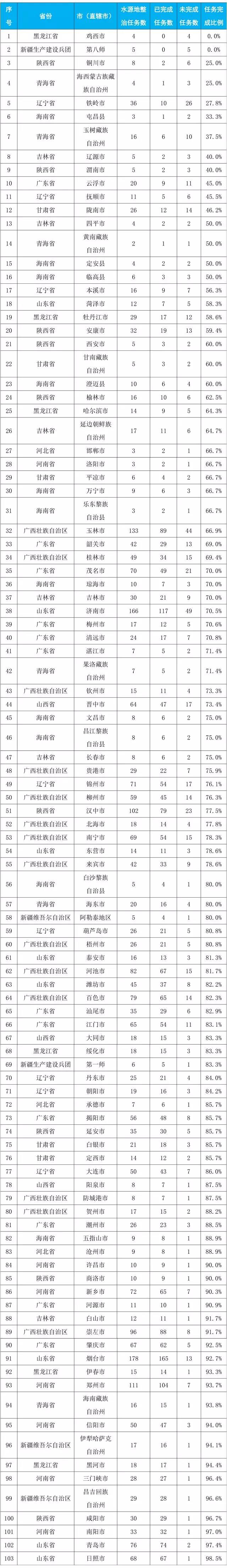 从各省份情况看,北京、福建、西藏、宁夏已率先完成水源地环境整治相关任务;新疆、河南任务完成率达到90%以上。从各地市情况看,超过1/3的地市(53个)已完成全部整治任务。