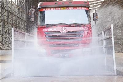 作为邢台市重点工业企业,德龙钢铁今年计划投资逾14亿元推进污染治理提标改造。图为企业运料车正在进行雾帘除尘。陈思佳供图