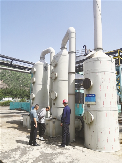图为太原市生态环境局古交分局执法人员正在检查企业VOCs治理设施运行情况。