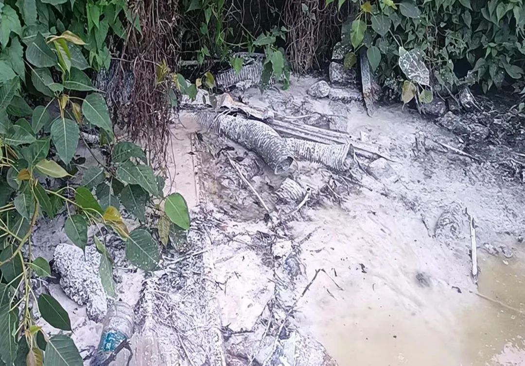 ▲上图为打浆工序清洗废水排放厂外废弃草塘