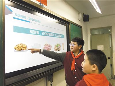 在上海普陀区真如文英小学,学生们正通过小游戏学习垃圾分类知识。