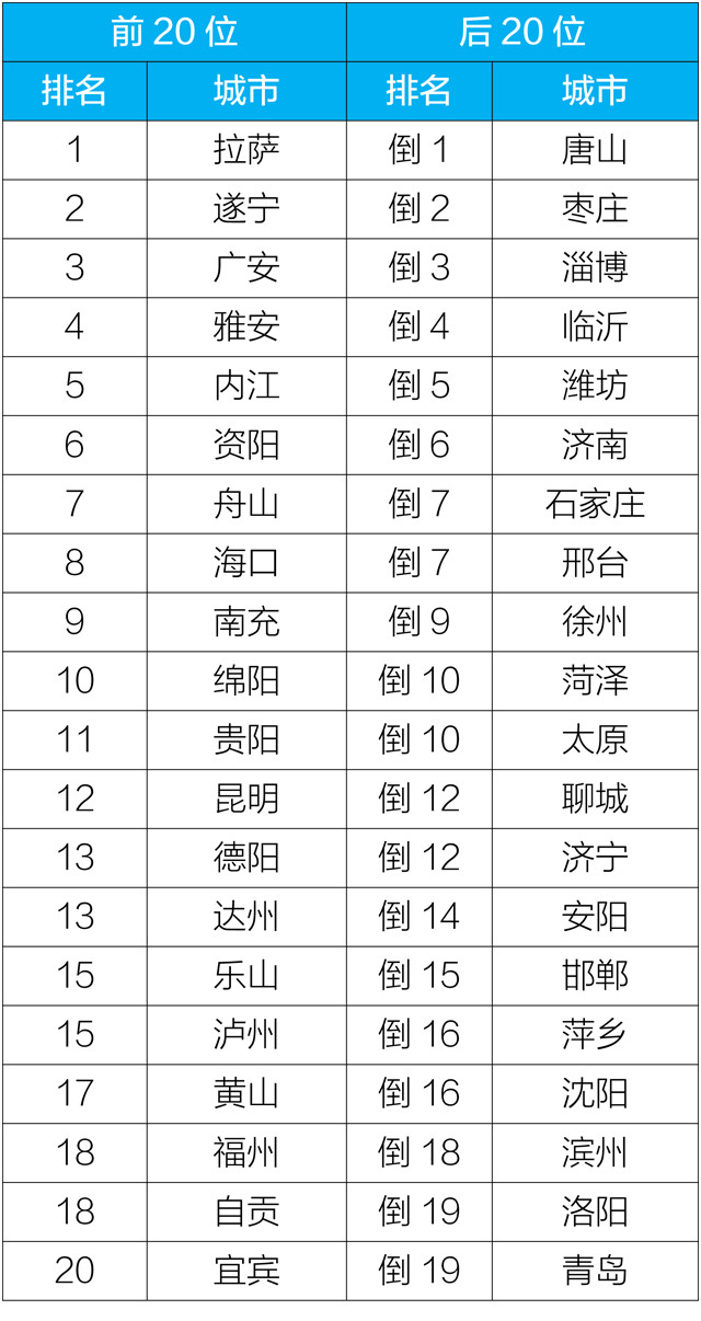 2019年10月,168个重点城市中唐山、枣庄、淄博市等城市空气质量相对较差(从倒数第1名至并列倒数第19名);拉萨、遂宁、广安市等城市空气质量相对较好(从第1名至第20名,见附表1)。