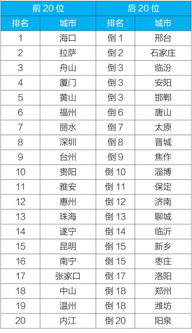 2019年1-10月,168个重点城市中邢台、石家庄、临汾市等城市空气质量相对较差(从倒数第1名至倒数第20名);海口、拉萨、舟山市等城市空气质量相对较好(从第1名至第20名,见附表2)。