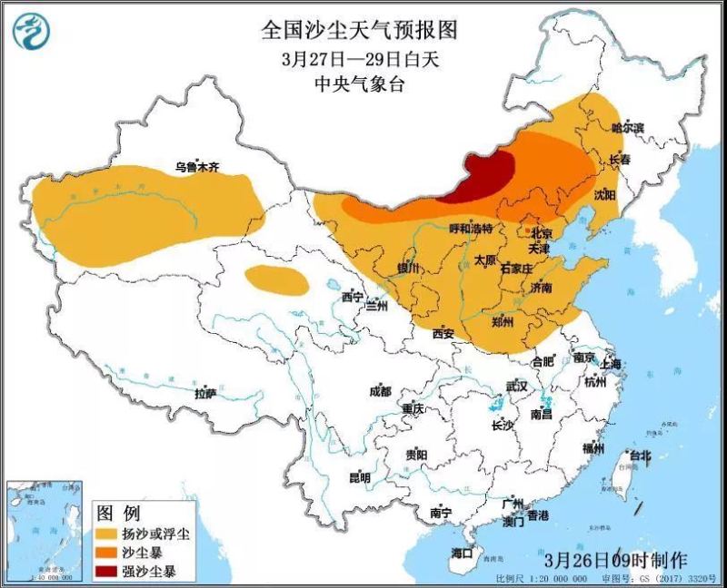 根据中央气象台最新预报结果,预计27日至29日白天,受蒙古气旋影响,北方地区将出现大范围沙尘天气,新疆东部和南疆盆地、青海西北部、内蒙古、宁夏、甘肃中东部、陕西中北部、山西、河北、北京、天津、山东、河南、安徽北部、江苏北部及辽宁西部、吉林西部、黑龙江西南部等地有扬沙或浮尘天气,其中,内蒙古中西部和东南部、河北北部、北京北部、辽宁西部等地的部分地区有沙尘暴,内蒙古中部偏北地区有强沙尘暴。受此影响,我国北方地区将出现大范围的空气质量恶化,总体转差3-4个等级,出现大范围的重度及以上污染,具体情况为: