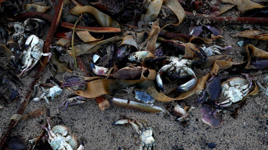 当地时间10月31日,英国Saltburn的海滩,人们发现大量海洋生物尸体被冲上岸。