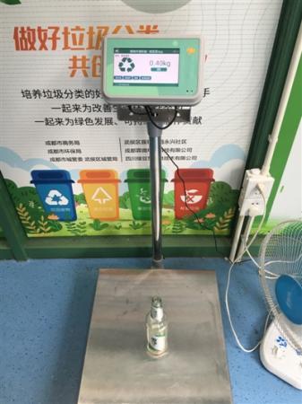 据工作人员介绍,碳中和和垃圾分类结合的关键是一把秤。除了称重,该秤还会算出可回收物对应的碳中和数据。记者当天在现场看到,一个0.4公斤的玻璃酒瓶和1.6公斤的纸板对应的碳中和数据都为0.001吨。