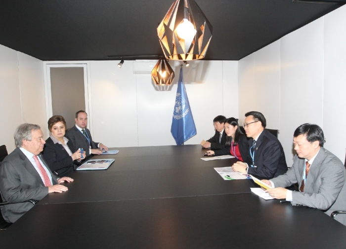在与古特雷斯进行会谈时,中方对9月联合国气候行动峰会发出的维护多边主义、落实《巴黎协定》、增强行动和支持力度表示赞赏。中方表示,气候变化是全人类面临的共同挑战,需要国际社会携手合作、共同应对。中国政府高度重视应对气候变化工作,将积极应对气候变化作为可持续发展的要求和负责任大国的担当。联合国及《联合国气候变化框架公约》秘书处在气候多边进程中发挥着重要作用,中方将一如既往地与联合国方面保持密切合作,积极发挥建设性作用,协调各方意见,推动本次大会完成遗留问题谈判,使全球尽快进入《巴黎协定》落实阶段。