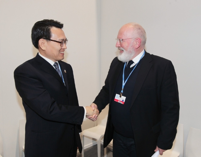 在会见蒂默曼斯和艾克浩特时,中方表示,欧盟是全球气候治理中的重要力量,长期以来,中欧在气候变化领域建立了密切的合作。中方愿加强与欧盟的气候政策对话和交流,坚持多边主义,反对各种形式单边主义,同欧方在内的国际社会一道,共同应对气候变化。希望欧盟展现更多灵活性,在《巴黎协定》实施细则谈判过程中与各方相向而行,做好2020年前行动和力度盘点,使全球尽快进入《巴黎协定》落实阶段。