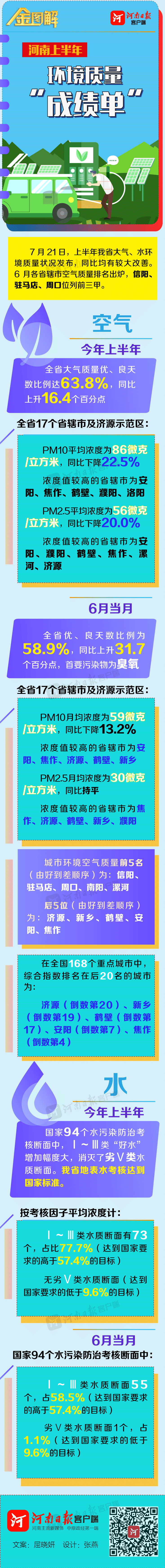 7月21日,河南省生态环境厅发布了上半年河南省大气、水环境质量状况,今年上半年全省大气、水环境均同比较大改善——大气质量优、良天数同比上升16.4个百分点,Ⅰ~Ⅲ类“好水”断面同比增加20个。