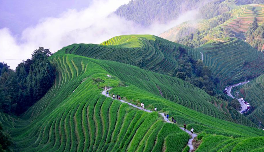处暑时节,广西桂林市龙胜各族自治县龙脊梯田绿意盎然,放眼望去,层层叠叠的梯田绿波荡漾,美不胜收,游客徜徉在满目翠绿的梯田之间放松心情、乐享假期。图为游客在龙脊梯田观光游览。 潘志祥 摄