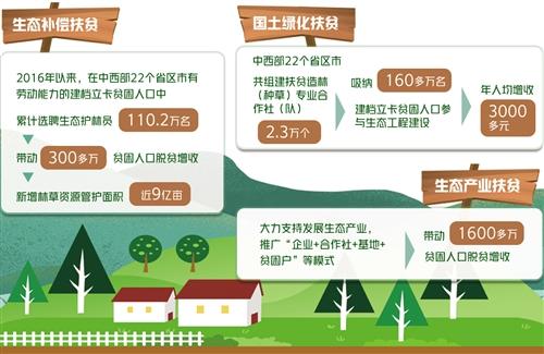 国土绿化扶贫方面,在天然林资源保护等重点生态工程项目和资金安排上向中西部地区倾斜。自2014年启动新一轮退耕还林还草以来,任务全部安排到中西部地区,累计达7450万亩。中西部22个省区市共组建扶贫造林(种草)专业合作社(队)2.3万个,吸纳160多万名建档立卡贫困人口参与生态工程建设,年人均增收3000多元。