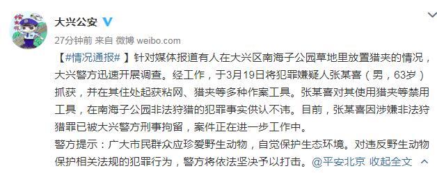 据北京市公安局大兴分局官方微博消息,针对媒体报道有人在大兴区南海子公园草地里放置猎夹的情况,大兴警方迅速开展调查。经工作,于3月19日将犯罪嫌疑人张某喜(男,63岁)抓获,并在其住处起获粘网、猎夹等多种作案工具。张某喜对其使用猎夹等禁用工具,在南海子公园非法狩猎的犯罪事实供认不讳。目前,张某喜因涉嫌非法狩猎罪已被大兴警方刑事拘留,案件正在进一步工作中。