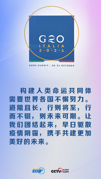 习主席强调,面对世界百年未有之大变局和世纪疫情,二十国集团作为国际经济合作主要论坛,要负起应有责任,为了人类未来、人民福祉,坚持开放包容、合作共赢,践行真正的多边主义,推动构建人类命运共同体。