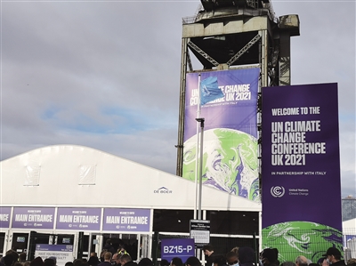 图为COP26会场。在这次会议期间,中美达成《中美关于在21 世纪20 年代强化气候行动的格拉斯哥联合宣言》,向世界发出了积极信号。本报记者牛秋鹏摄