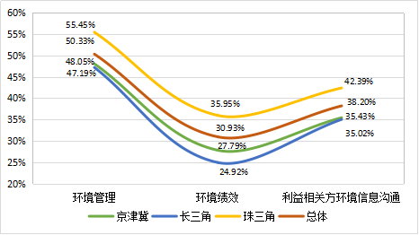 《报告》显示,与京津冀、长三角相比,珠三角企业披露水平最高,环境责任信息披露指数平均分为42.31,高于京津冀(34.51)、长三角(32.49)。从披露水平来看,环境责任信息披露质量皆有提升空间。