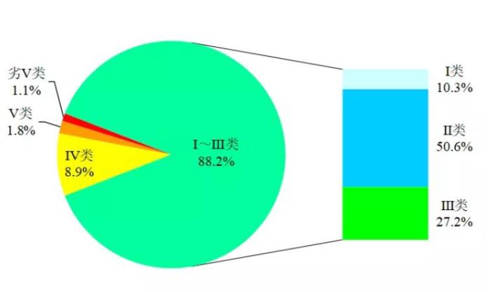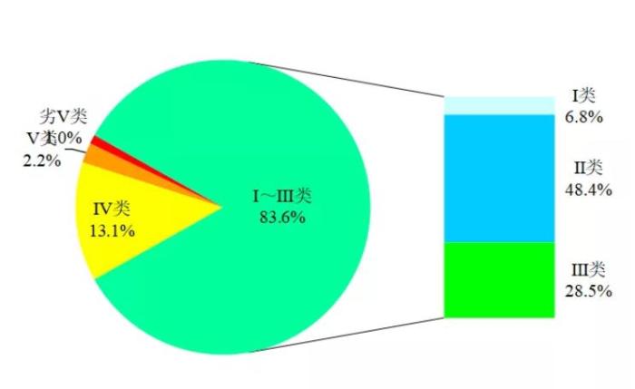 1-11月,3641个国家地表水考核断面中,水质优良(Ⅰ~Ⅲ类)断面比例为83.6%,同比上升1.7个百分点;劣Ⅴ类断面比例为1.0%,同比下降0.8个百分点。主要污染指标为化学需氧量、高锰酸盐指数和总磷。