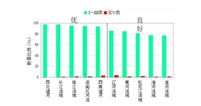 1-11月,长江、黄河、珠江、松花江、淮河、海河、辽河等七大流域及西北诸河、西南诸河和浙闽片河流水质优良(Ⅰ~Ⅲ类)断面比例为85.8%,同比上升1.8个百分点;劣Ⅴ类断面比例为0.8%,同比下降0.9个百分点。主要污染指标为化学需氧量、高锰酸盐指数和总磷。其中,长江流域、西北和西南诸河、浙闽片河流和珠江流域水质为优;辽河、黄河和淮河流域水质良好;松花江和海河流域为轻度污染。