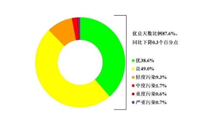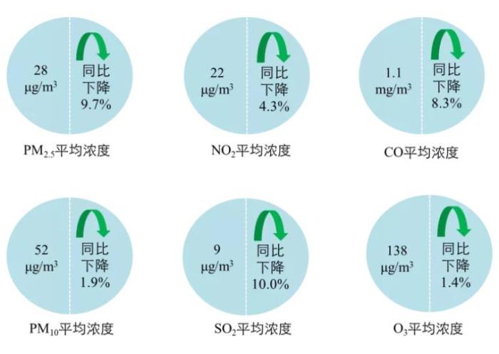 1-11月,全国339个地级及以上城市平均优良天数比例为87.6%,同比下降0.3个百分点;PM2.5平均浓度为28微克/立方米,同比下降9.7%;PM10平均浓度为52微克/立方米,同比下降1.9%;O3平均浓度为138微克/立方米,同比下降1.4%;SO2平均浓度为9微克/立方米,同比下降10.0%;NO2平均浓度为22微克/立方米,同比下降4.3%;CO平均浓度为1.1毫克/立方米,同比下降8.3%。