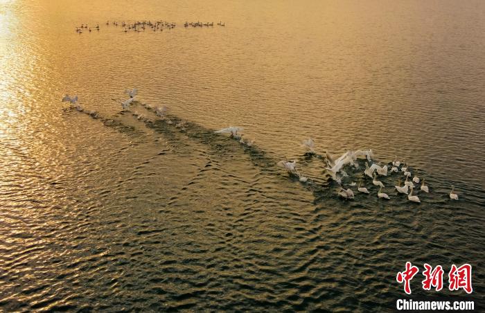 一批过境栖息的白天鹅,在内丘县鹊山湖国家湿地公园湖中游荡、觅食。(无人机照片) 石晓鹏 摄