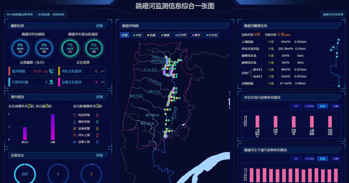 近年来,九龙坡区聚焦智慧环保建设、助力提升环境应急效能,先后投入1000余万元建成集视频监控、水质监测和预警报警等功能于一体的“跳磴河智慧水务系统”,主要包括水质自动监测站22套、流量自动监测站10套,视频监控32套,窨井液位监测280个,能够全方位实时掌握跳磴河水质情况,为应急处置提供强有力的支撑。水质监控及预警功能,为获取水质异常信息另辟蹊径;流速监测功能,为水文参数获取及污染团迁移推断提供依据。