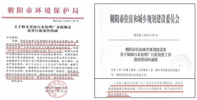 2018年5月原朝阳市环境保护局向原朝阳市住建委移交污泥案件,2018年8月原朝阳市住建委通报三家污水处理厂污泥堆存场问题。图片来源:生态环境部微信公众号