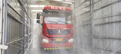 在河北方远建材有限公司,进出车辆经过全自动洗车系统冲洗后,车身洁净如新。