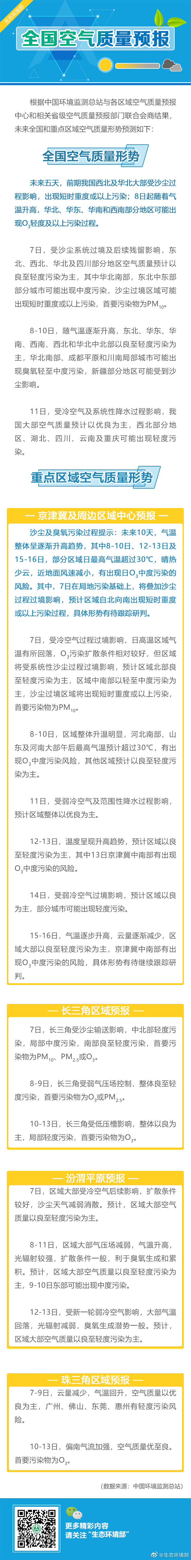据生态环境部官方微博消息,未来五天(5月7-11日),前期我国西北及华北大部受沙尘过程影响,出现短时重度或以上污染;8日起随着气温升高,华北、华东、华南和西南部分地区可能出现O3轻度及以上污染过程。